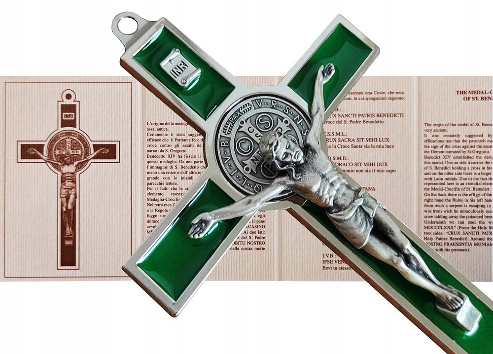Красиво изготовленный металлический бенедиктинский серебряный крест с зеленым начинкой - итальянский продукт - высокое качество !!! h1>