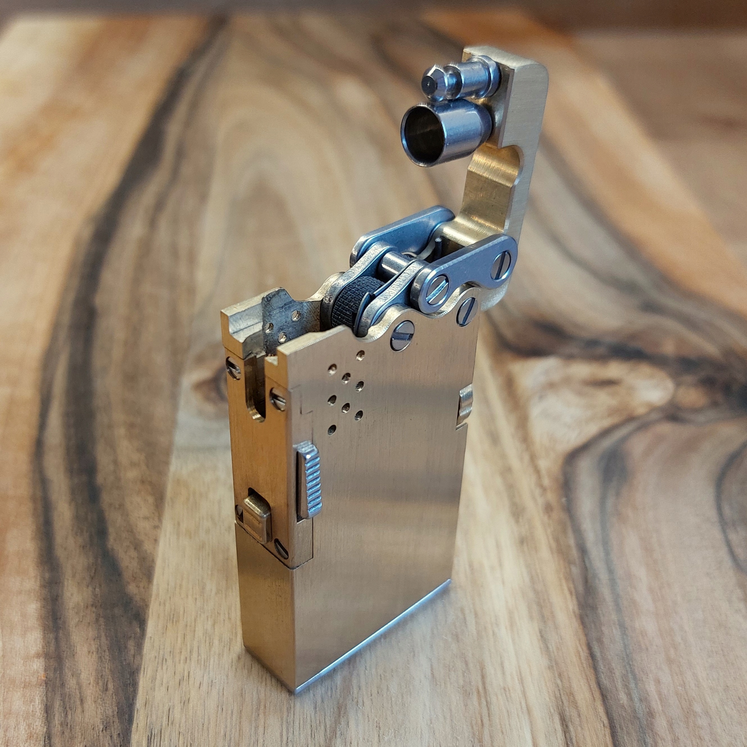 Бензиновая зажигалка, специальная конструкция, латунь и нержавеющая сталь, хит