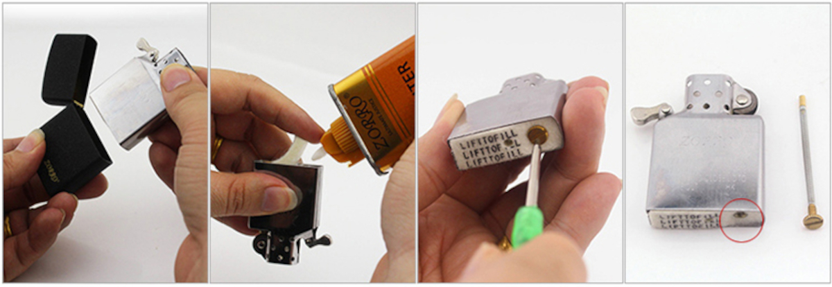Это так же просто, как и в случае зажигателей газа, но для заполнения потребуется специальный бензин для зажигалок. Ни при каких обстоятельствах бензин со станции! Это гораздо больше легковоспламеняющееся