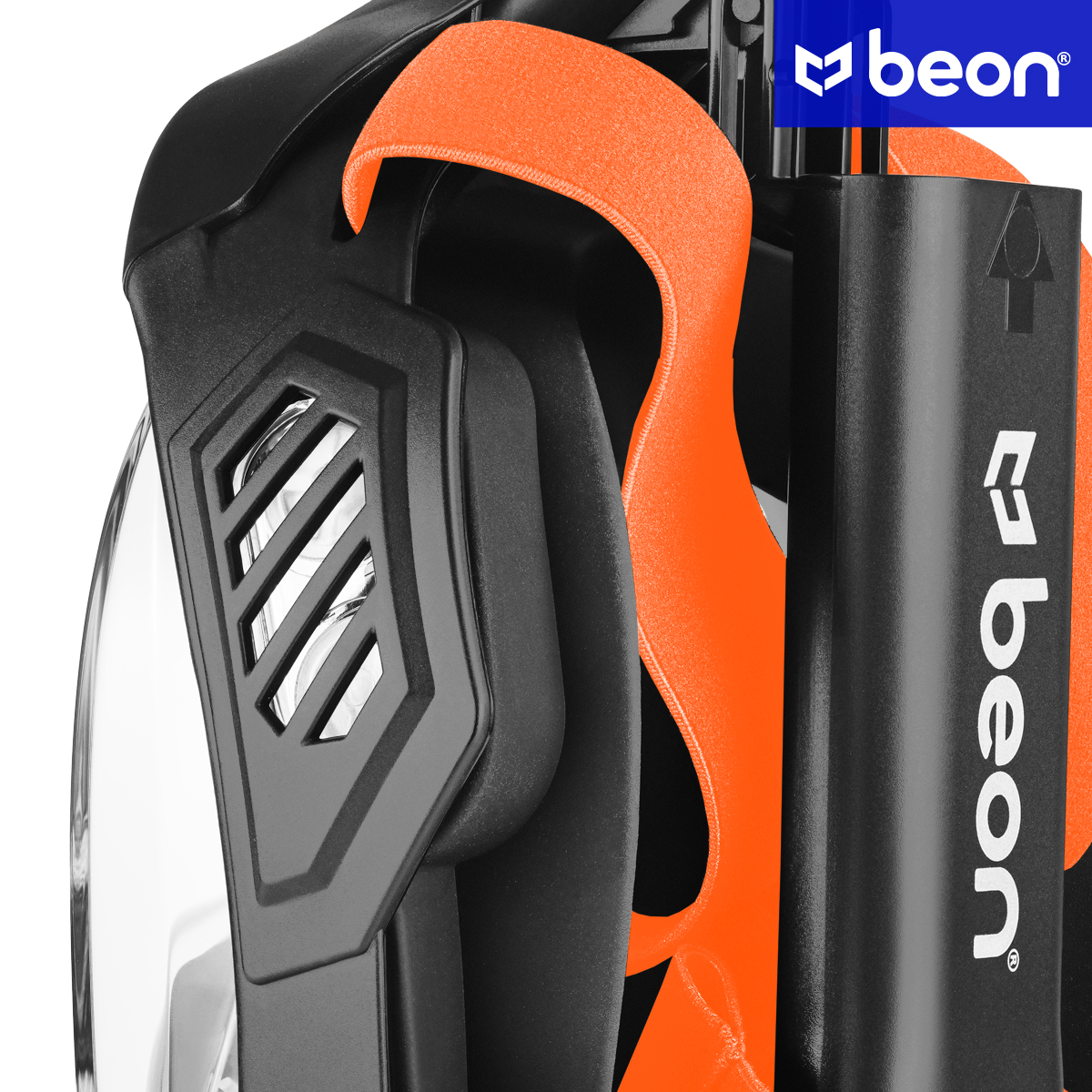 В маске Beon Exo G1 мы использовали пряжочный механизм, соединяющий трубку с маской. Благодаря этому трубка всегда прикреплена к маске, даже в сложенном виде.