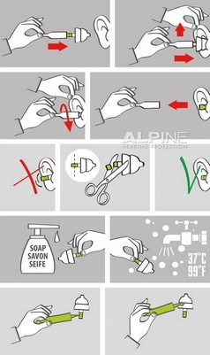 Как без проблем надеть заглушки ALPINE? Для надевания заглушек используется трубка, входящая в комплект. Вставьте заглушку-фильтр в трубку, осторожно потяните ухо вверх и вставьте заглушку в ушной канал. Поворачивайте трубку до тех пор, пока вилка не будет удобно сидеть в ухе.