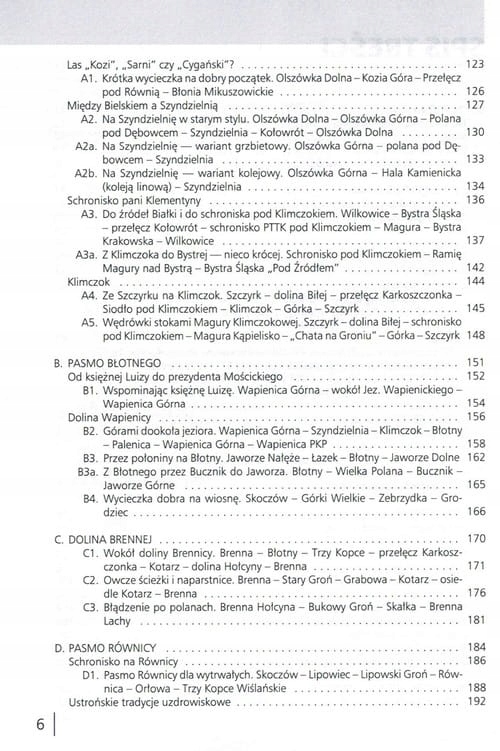 Путеводитель подготовлен для туристов, желающих посетить Силезские Бескиды с рюкзаком. Выбор маршрутов большой. Описаны как легкие, многочасовые поездки, подходящие для отдыхающих из Вислы или Щирка, так и длинные, иногда многодневные маршруты, пересекающие весь хребет. Описания маршрутов охватывают все Силезские Бескиды, включая довольно экзотические участки польско-чешско-словацкой границы в районе Гировы. Описываемая область разделена на семь частей, рассмотренных в отдельных главах: