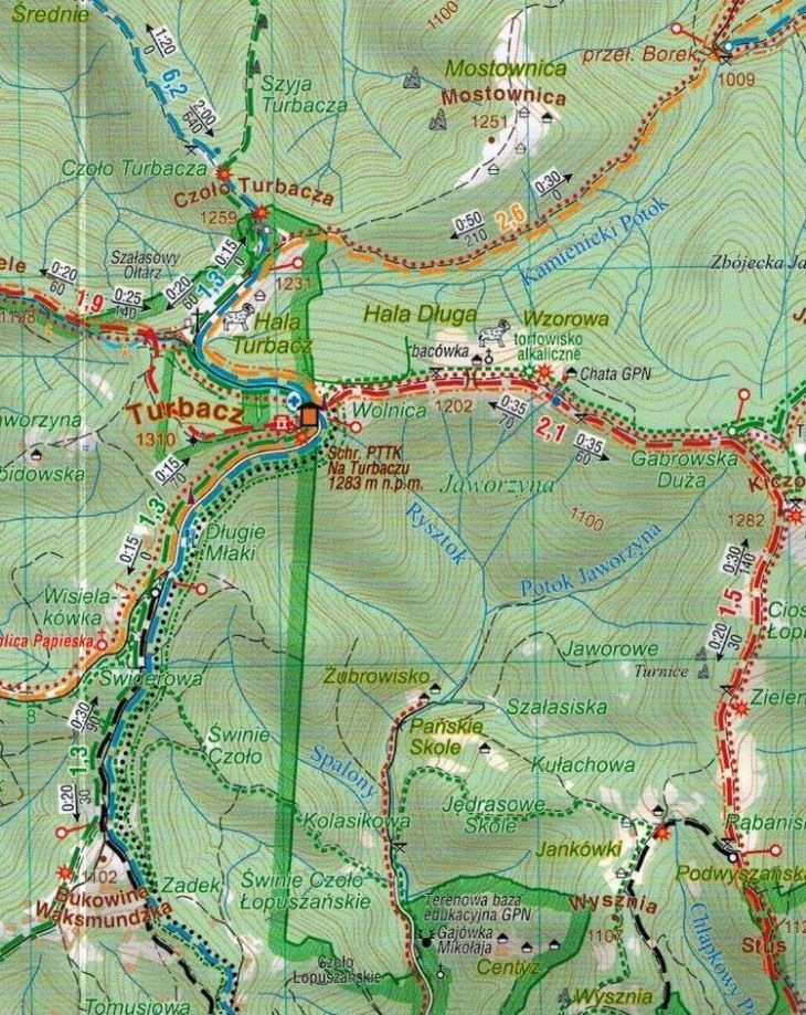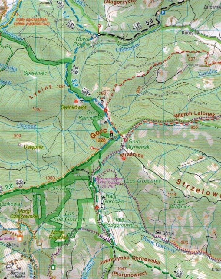 На карте также показаны Висницкое предгорье и восточная часть Велицкого предгорья. Объем карты определяют Бжеско и Добчице на севере, Рабка и Старый Сонч на юге, Йорданув на западе и Новы-Сонч на востоке.