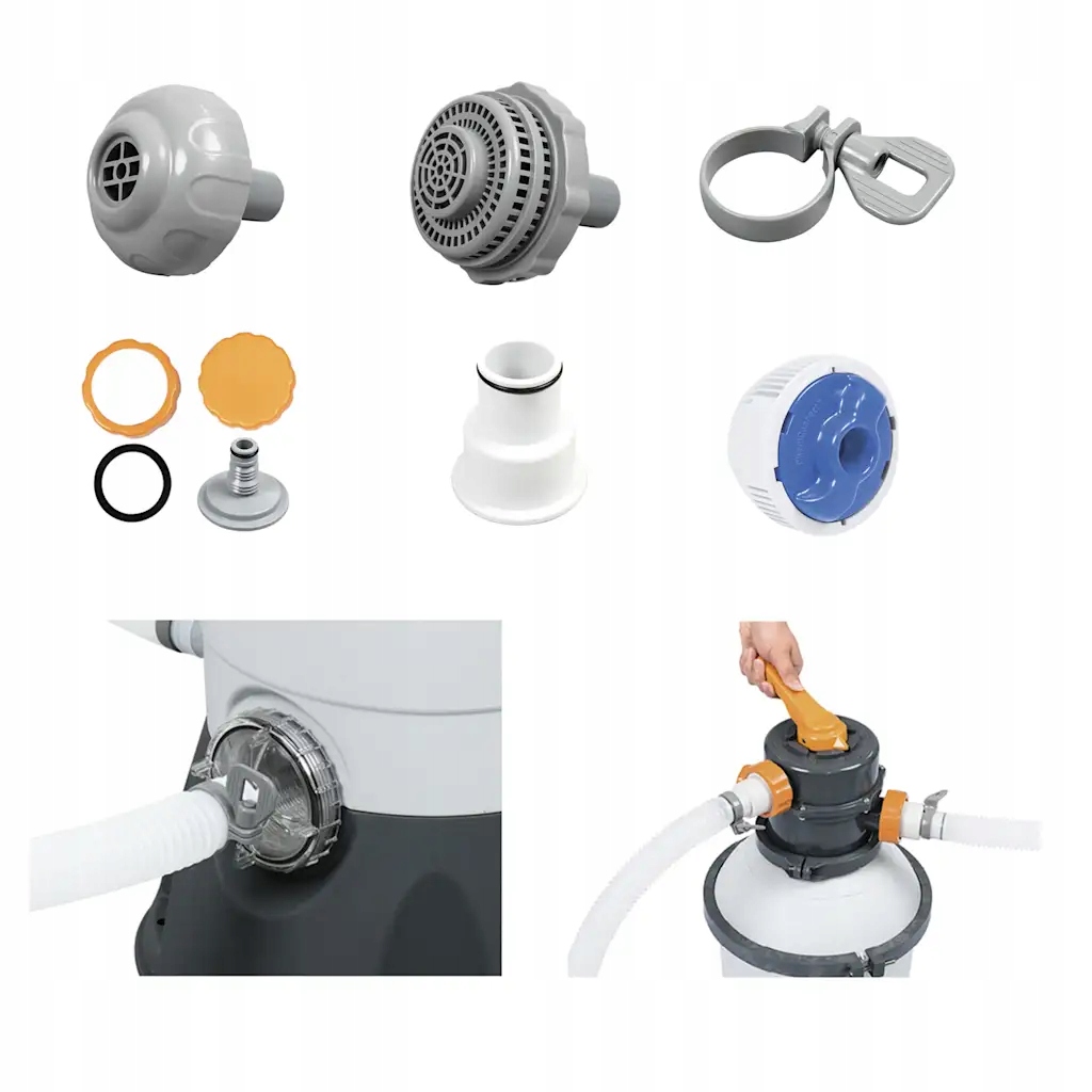 Flowclear Filter Filter Pump от Bestway - отличный выбор для поддержания чистоты грунтовых бассейнов без использования химических веществ. Насос фильтров основывает свою работу на естественной системе фильтров: вода перекачивается в резервуар, заполненный кварцевым песком, который поглощает загрязнение и молекулы, создавая тем самым чистую воду. Диспенсер ChemConnect обеспечивает чистоту воды в бассейне, высвобождая и поддерживая постоянный уровень хлора, необходимый для поддержания надлежащего химического баланса. Корзина до фильтра является дополнительным механизмом, фильтровавшим большие элементы, такие как листья, волосы и почва. Он защищает ротор насоса и помогает устройству работать плавно. Насос фильтров содержит 6-часовой клапан, с помощью которого вы можете установить фильтрацию воды, закрытие (разрезание потока воды), обратный поток (для очистки песка), полоскание (для первого запуска, очистка и выравнивания уровня песка), вода, истощая от бассейна и непрерывный поток воды. Структура верхнего воротника обеспечивает вращение на 360 °, что обеспечивает быструю и простую установку. Примечание: песок не прикреплен. Это устройство не предназначено для использования лицами (включая детей) с ограниченными физическими, сенсорными или умственными способностями или людьми без опыта и знаний, если они не находились под наблюдением или не получили инструкции по использованию устройства от лица, ответственного за их безопасность. Этот продукт не игрушка. Не позволяйте детям играть с этим устройством. Gpsr