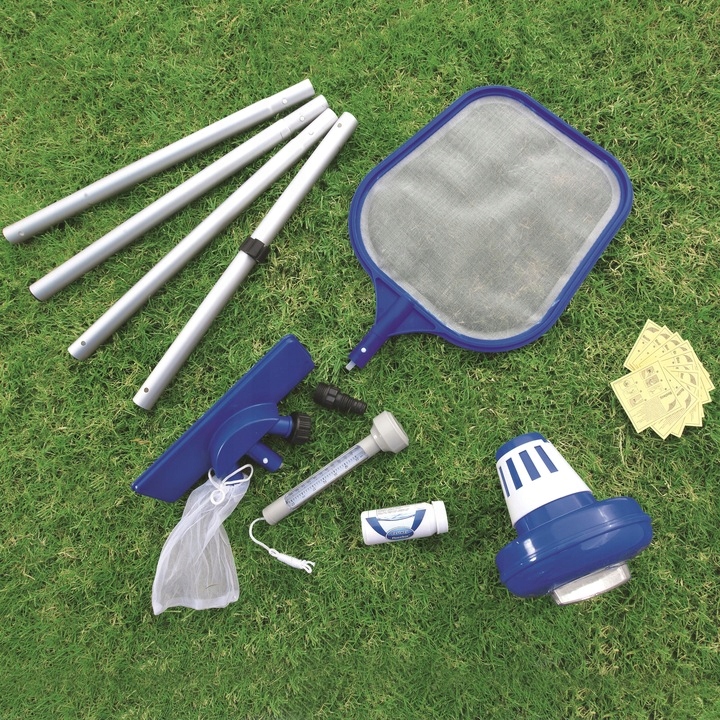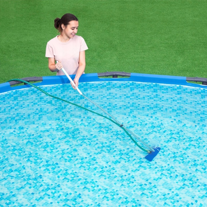 Этот базовый набор для чистки необходим, если вы хотите поддерживать чистоту резервуара бассейна. Он состоит из регулируемой телескопической палки (ручки), к которой можно прикрепить один из двух концов: сетку для улавливания загрязнений или насадку для пылесоса, которая за счет отрицательного давления (при подключении к садовому шлангу) создает вихрь, который собирает грязь со дна бака, они собираются в небольшую сеточку.
