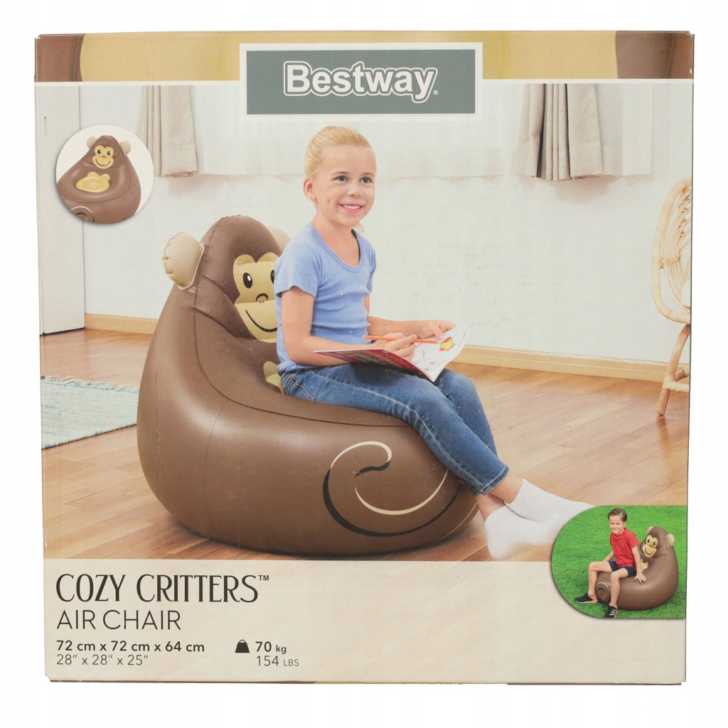 <ул> <ли> Цвет: коричневый <ли> Материал: ПВХ <ли> Максимум нагрузка: 70 кг <ли> Размеры кресло: 72 см х 72 см х 64 см. <ли> Размеры упаковка: 24 см х 24 см х 6 смМилый детское кресло, который будет не только идеальным местом для отдыха, но и... интересное дополнение для детской комнаты. Интригующая графика с обезьянкой сделает вашего ребенка более охотно сидеть за столом. Стул можно использовать и дома, и во дворе – ребенок заслуживает минуты комфорта повсюду. После сдувания кресло занимает мало места, спасибо, ты можешь легко это скрыть. Включает ремонтный патч на случай несчастных случаев. незначительные повреждения.