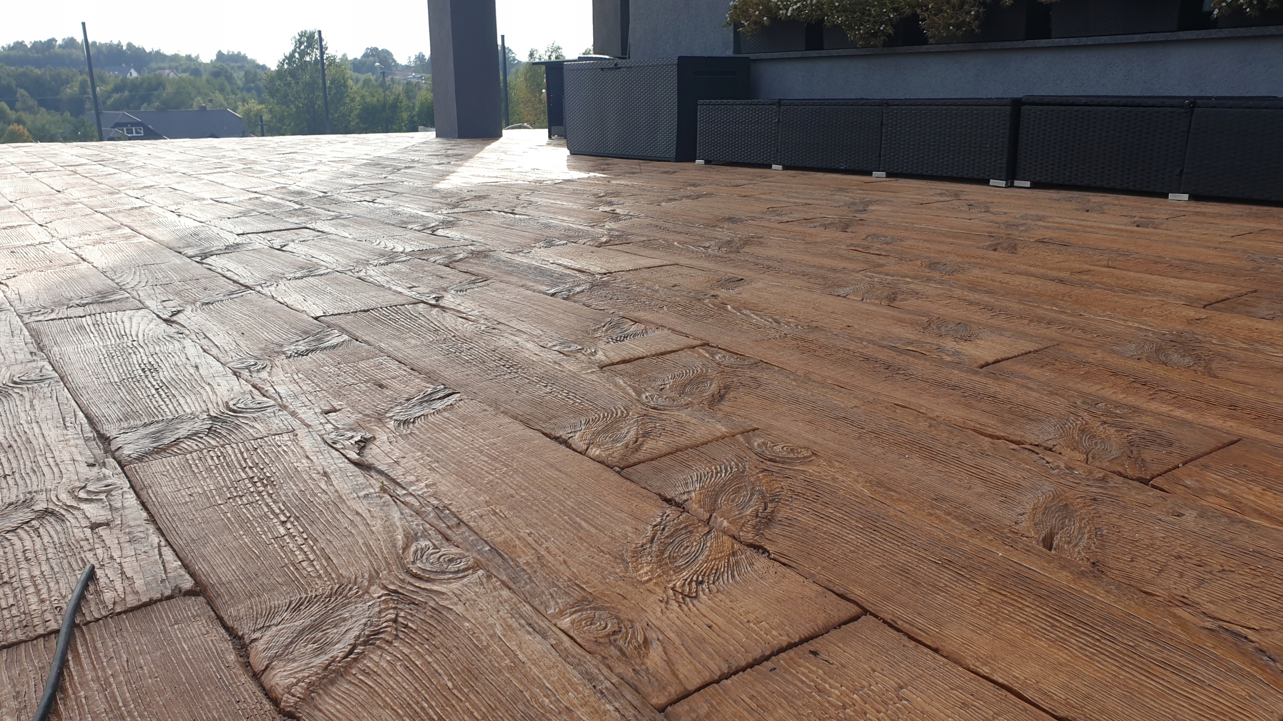 Правильно подготовленная поверхность. Перед началом работ землю необходимо выровнять. Приклеиваем бетонную древесину к поверхности с помощью высокоэластичного полимерного клея (имеется в нашем предложении). Его следует распределить равномерно по всей поверхности. На подготовленную площадку укладываем бетонные плиты. Расстояния между отдельными досками заделываем песком.