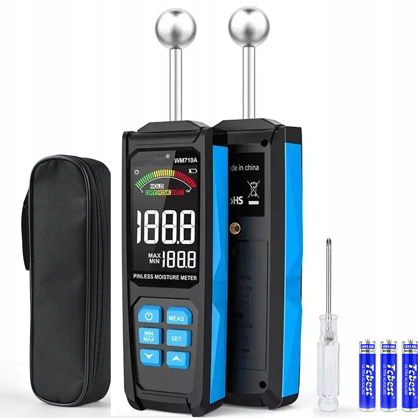 - Измеритель влажности использует точный сплав и высокопроизводительный чип обработки, чтобы обеспечить тщательное измерение, быстрый отклик и разрешение 0,1%.