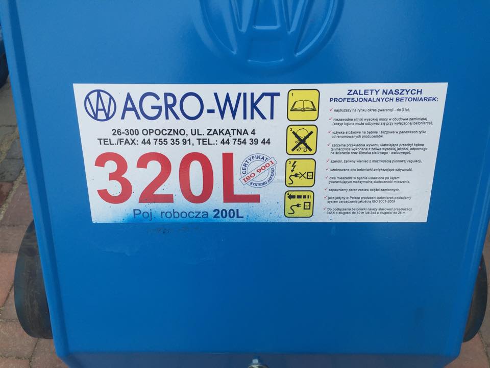 Бетонозмішувач 320 ЛІТРІВ AGRO WIKT BWA-200/230V 3M