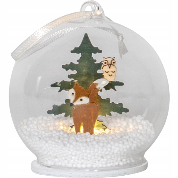 Стеклянный шар с деревянным декором, вырезанным лазером. Лиса и сова ждут, чтобы отпраздновать Рождество со своими друзьями. Маленькие светодиодные фонари освещают шар внутри и создают настроение. Изделие питается от прилагаемой батареи