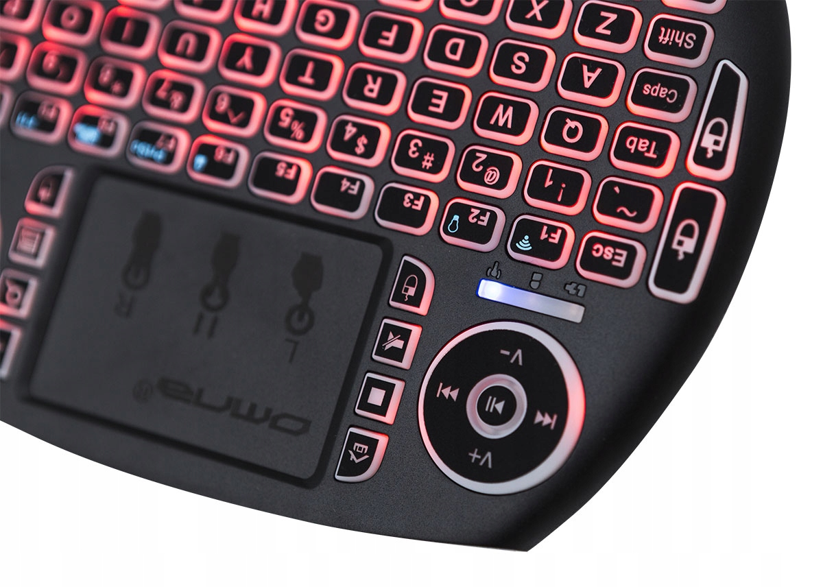 Мини-клавиатура Smart Android TV box имеет 3 цвета подсветки: красный, синий и зеленый. Меняем цвета комбинацией клавиш Fn+F2. Подсветку можно отключить, если она вам не нужна. Также устройство имеет систему SLEEP MODE (спонтанная подсветка только после 5 секунд отсутствия реакции), что существенно экономит заряд батареи.