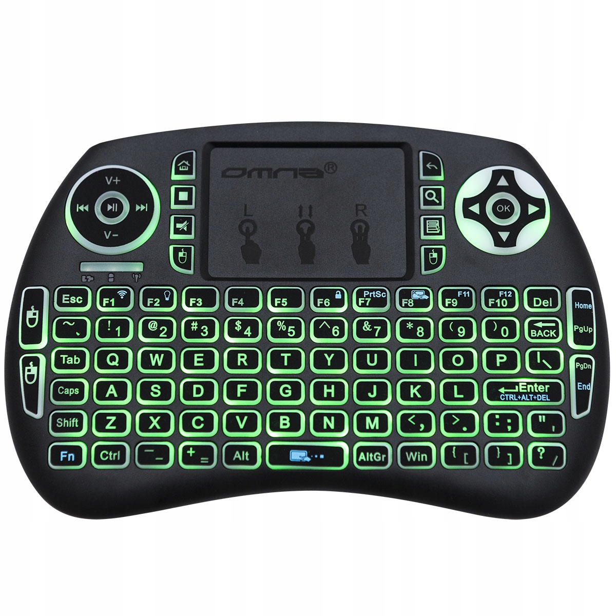 Предлагаемая беспроводная клавиатура представляет собой многофункциональную мини-QWERTY-клавиатуру со встроенным сенсорная панель (тачпад) с поддержкой жестов и беспроводным USB-приемником.
