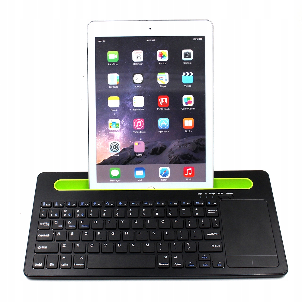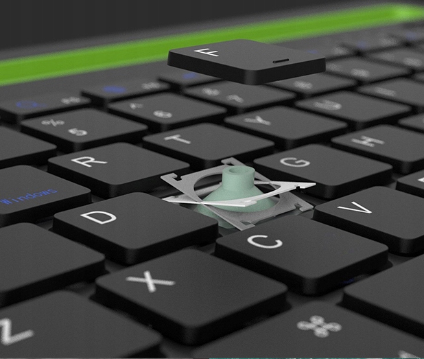 Характерной особенностью клавиатуры является зеленая выемка шириной 26 см, расположенная над клавишами. Благодаря своей большой глубине и соответствующему профилю он может удерживать мобильные телефоны и планшеты в любом положении.