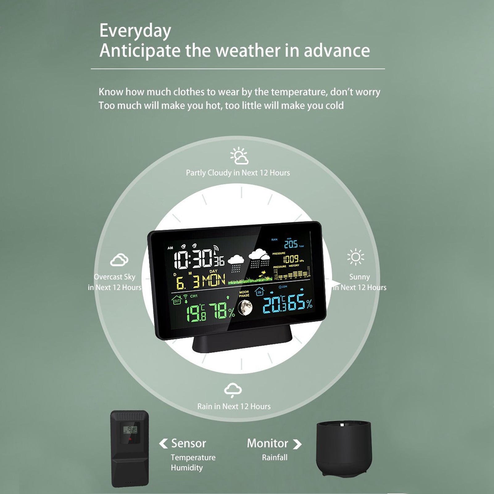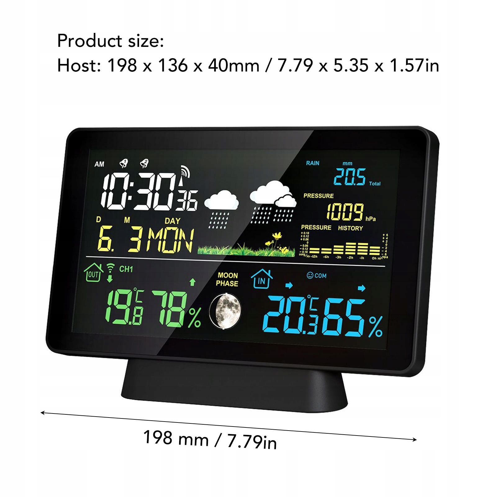 - 8 в 1 Функция: эта метеорология оснащена 8 необходимыми функциями, включая показ времени/даты, радиосигнал, прогноз погоды, осадки, температуру и влажность, фазу луны, температуру и влажность в комнате и регистрация давления давления воздуха. Предоставляет полную информацию о погоде у вас под рукой.