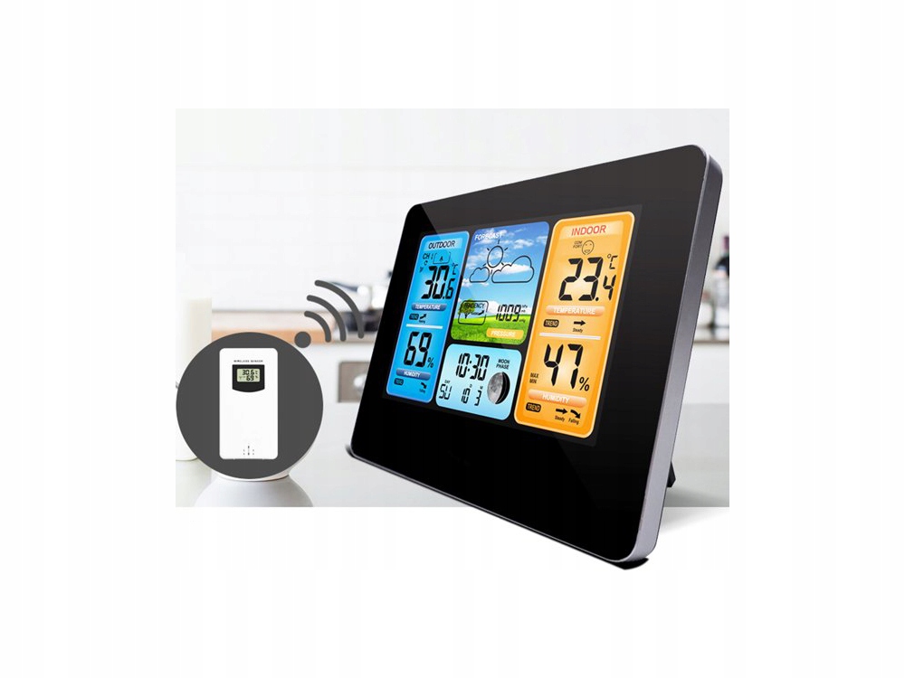Станцию также можно использовать как часы, будильник и календарь (с указанием текущей даты и дней недели). На выбор доступны 7 языков. Устройство показывает температуру и влажность как снаружи, так и внутри помещения. Кроме того, он имеет большой и четкий ЖК-дисплей, с которого мы можем легко прочитать интересующие нас показатели. Станция также показывает фазы луны и имеет функцию прогноза погоды.