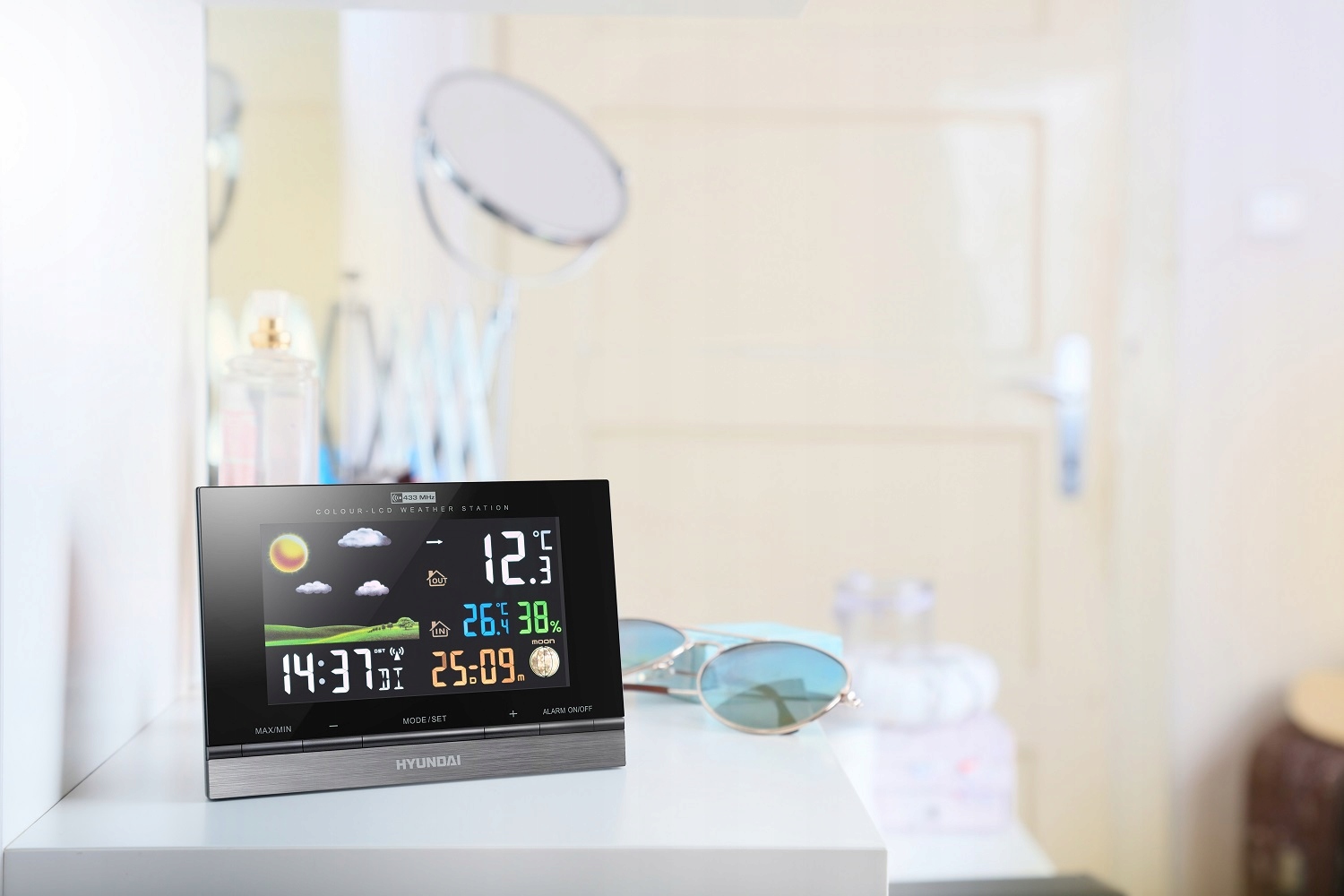 Самое важное Функции метеостанции Hyundai WS2303 можно разделить на 3 части. Первое, что вас заинтересует, — это анимированный прогноз погоды на ближайшие несколько часов. Далее, это индикатор внешней температуры и влажности. Метеостанция также позволяет отображать внутреннюю температуру. Для внешних и внутренних значений он также сохраняет в памяти их максимальные и минимальные значения.