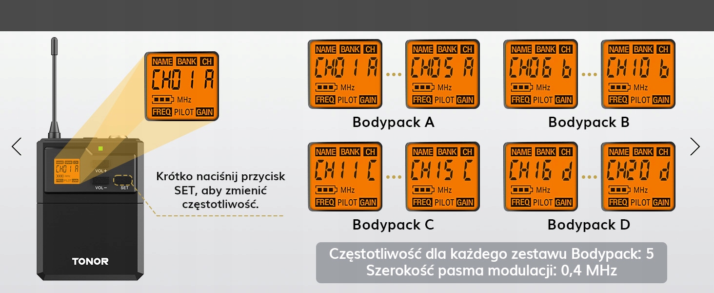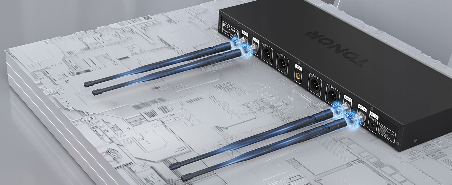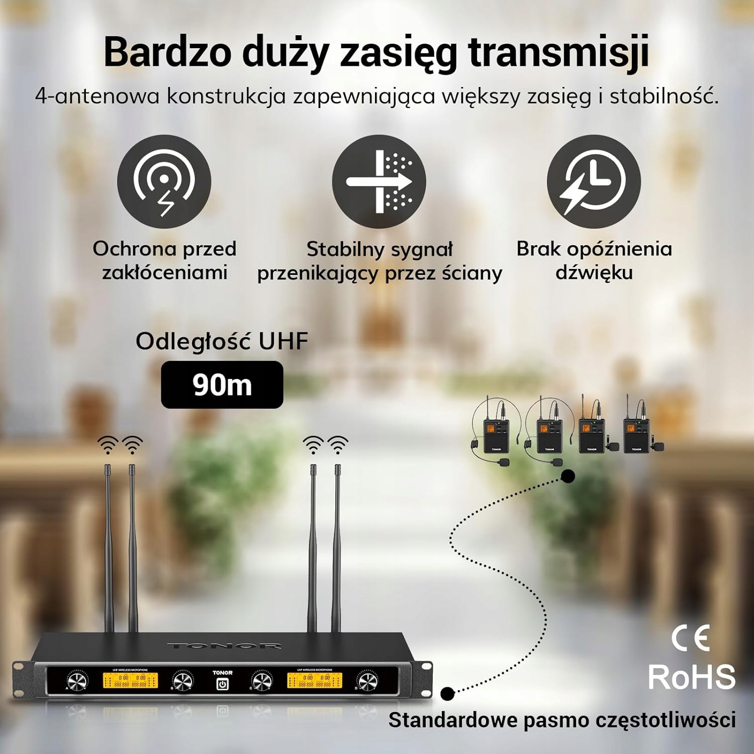 Беспроводная микрофонная система TONOR TW844 — это профессиональное аудиорешение, предназначенное для мероприятий, презентаций, записей, а также сценических применений, таких как свадьбы, конференции и живые выступления. В комплект входят четыре микрофона-гарнитуры и четыре поясных передатчика, которые также можно использовать с петличными микрофонами (входят в комплект). Все работает с аккумуляторным приемником, поддерживающим 20 регулируемых каналов (4 x 5 частот), обеспечивающих дальность передачи до 90 метров.