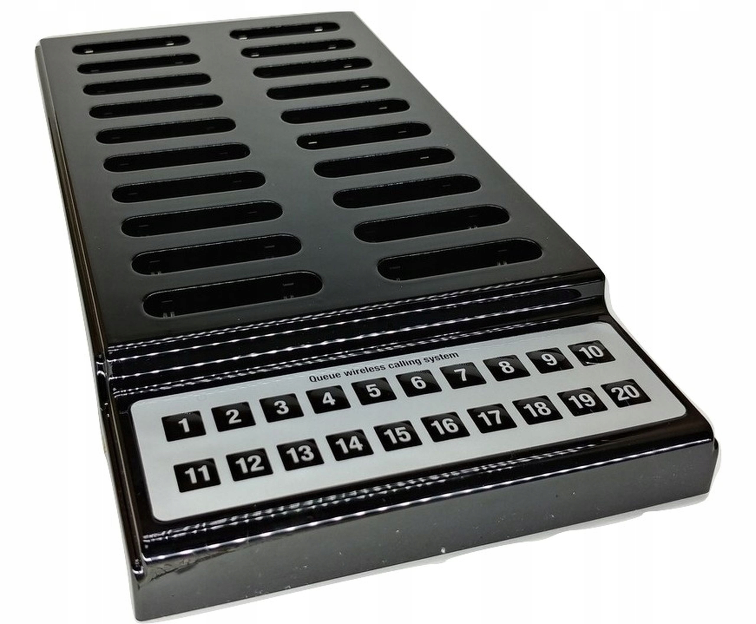 Передатчик системы Easy Service также является зарядным устройством, имеет 20 кнопок для вызова определенных пейджеров и возможность зарядки 20 пейджеров одновременно.