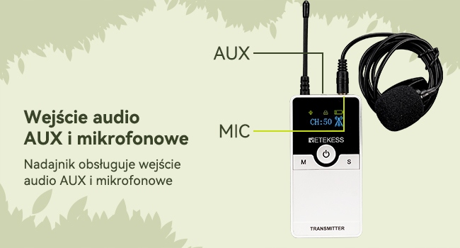 - Передатчик имеет входной разъем 3,5 мм, поддерживает вход AUX (например, MP3, смартфон, MP4, компакт-диск и т. д.) и вход MIC (микрофон) ли>