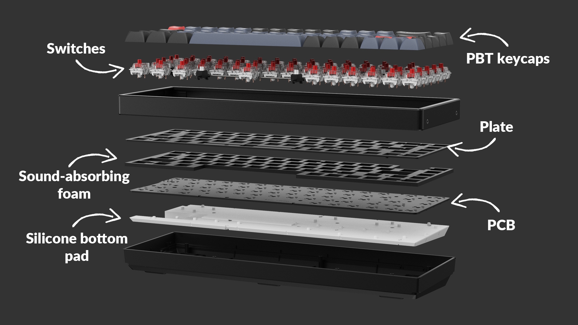 K6 Pro G3 был переработан изнутри, чтобы вам было удобнее печатать. Внутри клавиатуры имеется дополнительный пенопласт, поглощающий звук. Также имеется толстая силиконовая демпфирующая подушечка и стальная пластина, которые обеспечивают отзывчивую обратную связь и мягкий звук набора текста. А дополнительный вес повышает стабильность клавиатуры.