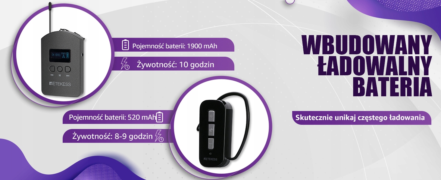 Сбалансирован литиевой батареей; Система беспроводного гида работает до 9-10 часов; хватит на день работы; слушатели не пропустят ни одной новости.