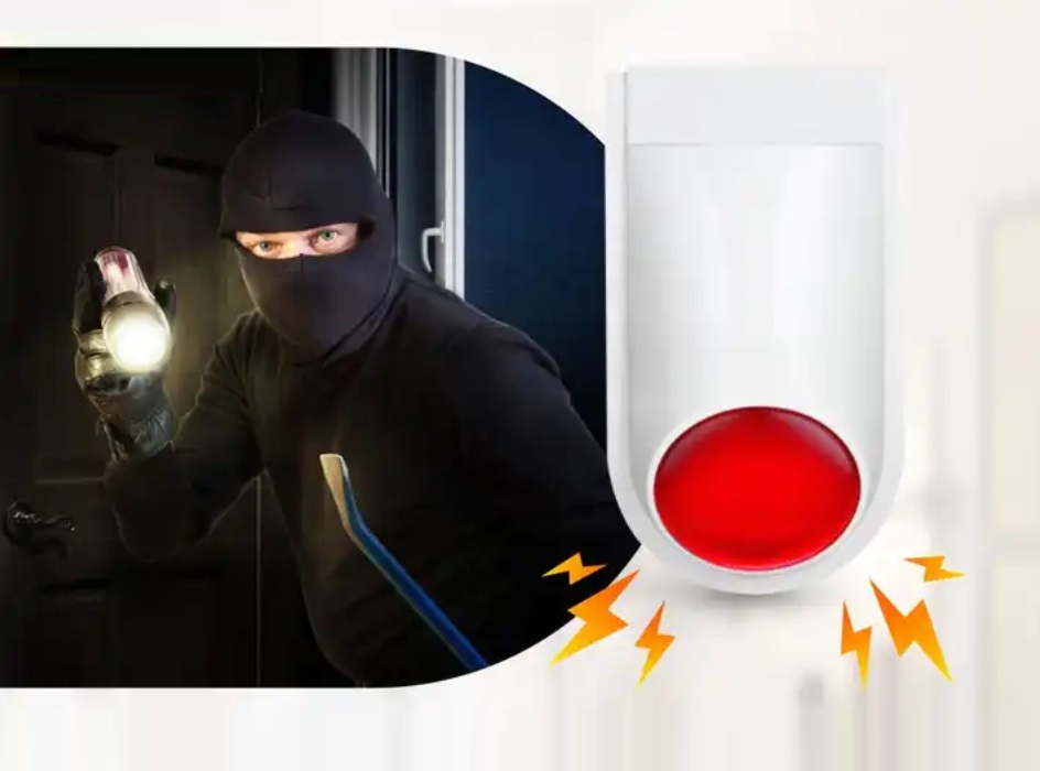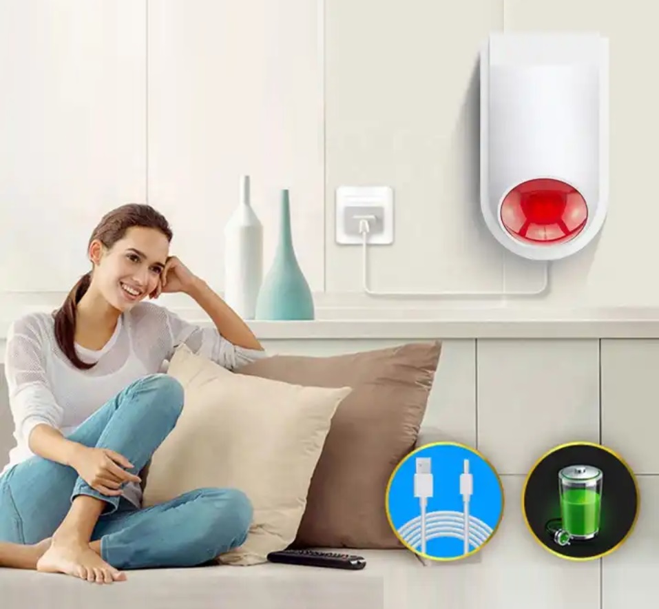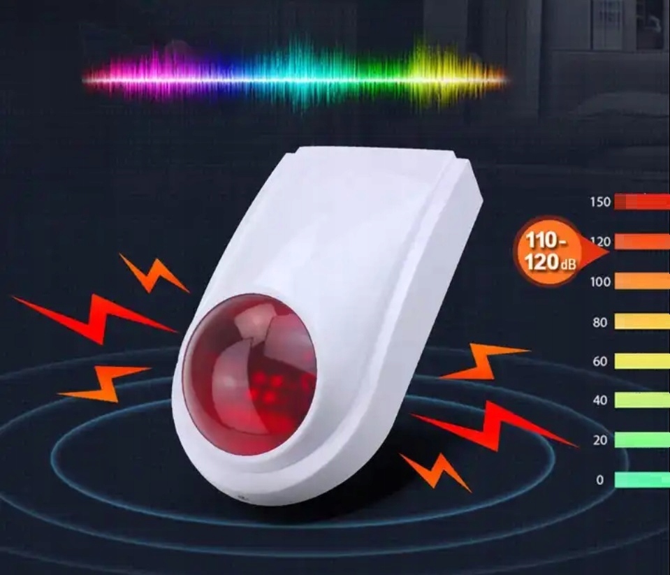 При обнаружении движения одним из датчиков системы сигнализации включается очень громкая тревожная сирена и светодиодная сигнализация.