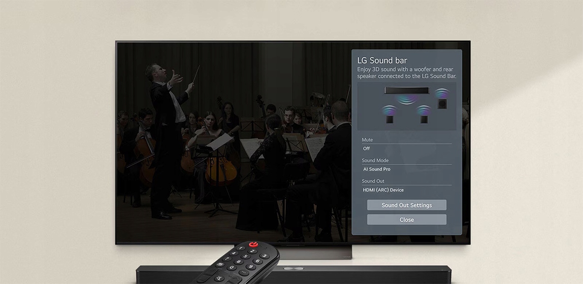 Почувствуйте обширное, выразительное звуковое чудо. LG Soundbar преобразует 2-канальный звук в многоканальный, обеспечивая глубокий звук, резонируя по всему пространству