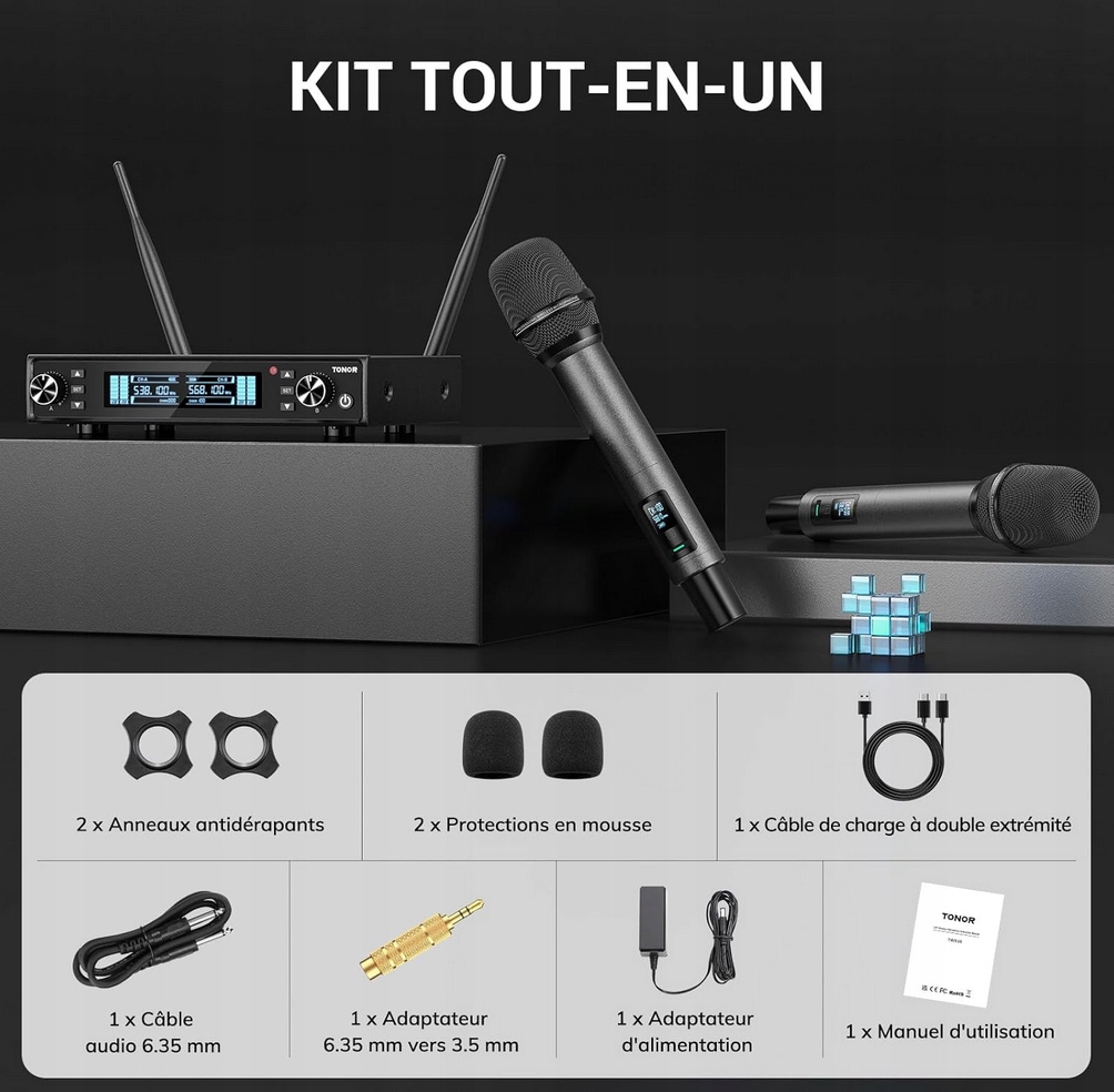 Набор из двух динамических микрофонов UHF, созданных для требования для требований пользователей. Идеально подходит для караоке, сценических представлений, свадеб, церквей, диджеев или речей. Технология последнего поколения гарантирует стабильное соединение, отличное качество звука и удобство использования без кабелей.