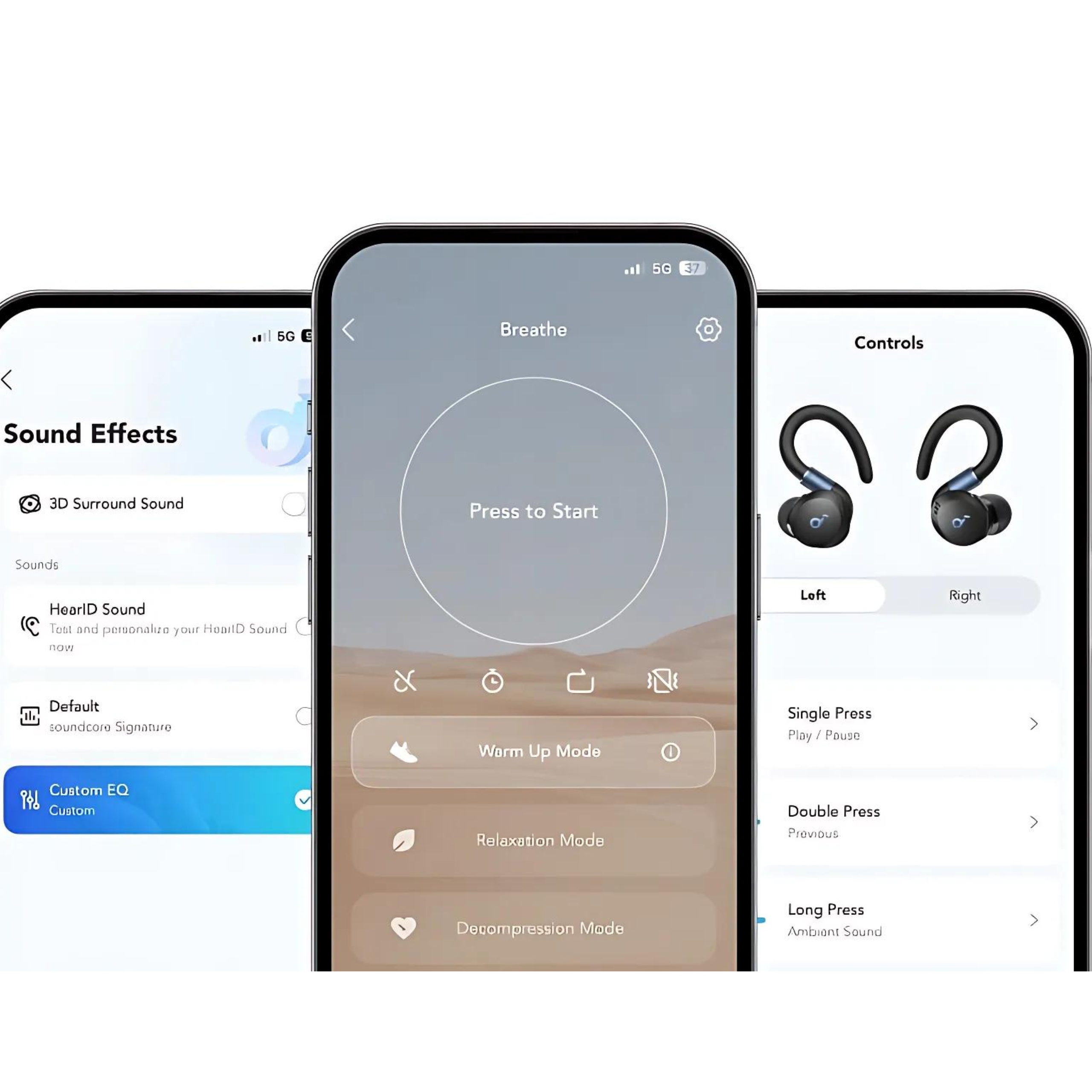 Приложение soundcore позволяет вам полностью персонализировать качество звука. Вы можете настроить элементы управления, улучшить качество звука и включить эффекты объемного звука. Приложение также предлагает дыхательные упражнения, которые полезно выполнять перед тренировкой.