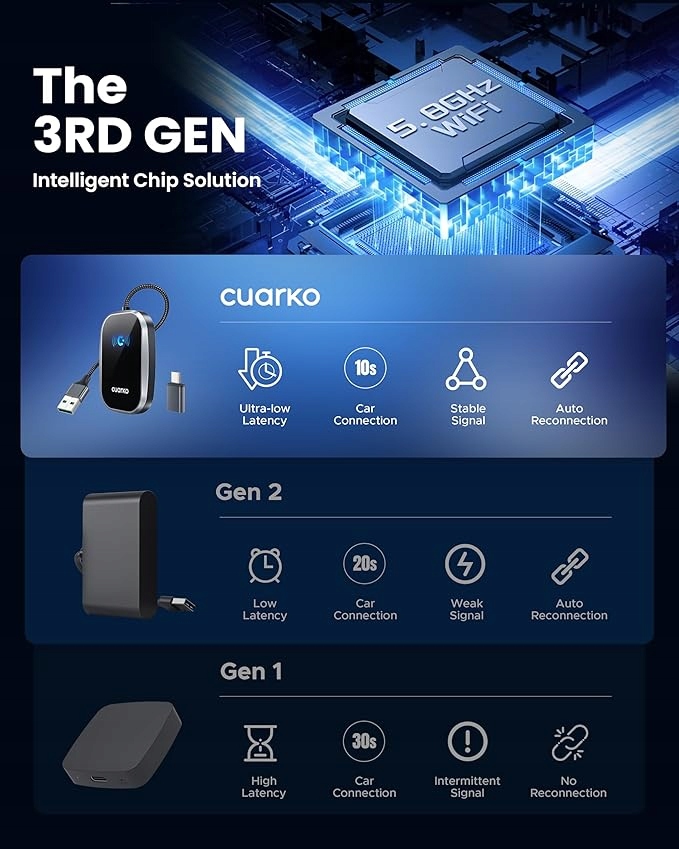 [Быстрое и простое соединение] Наслаждайтесь молниеносной связью с беспроводным адаптером Cuarko Android Auto с Wi-Fi 5,8 ГГц и Bluetooth 5.3, обеспечивающим скорость передачи данных до 30 %. Наслаждайтесь доступом в реальном времени к картам, мультимедиа и сообщениям с в 3 раза более быстрым откликом на дисплее вашего автомобиля. Просто коснитесь телефона, чтобы мгновенно подключиться, упрощая настройку и улучшая качество поездки благодаря простому и беспроблемному подключению.