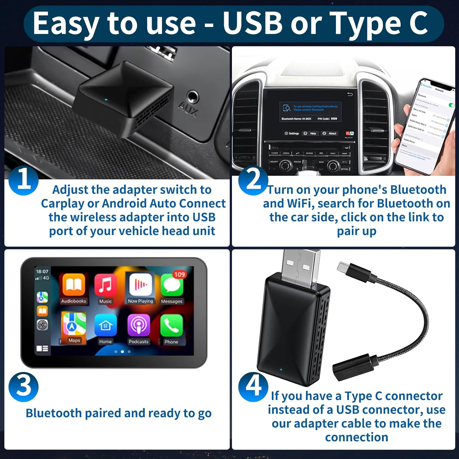 ✅ Монтажное оборудование: тип C, CarPlay Android Auto беспроводной адаптер
