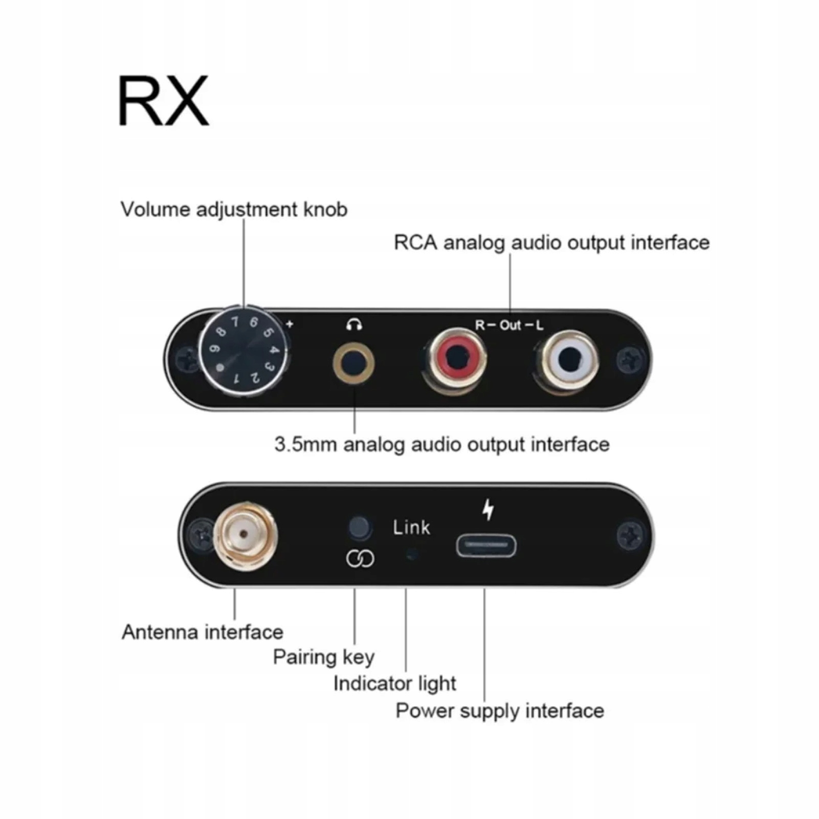 3. Интерфейс RCA и 3,5 мм: автоматически подключается после включения питания, поддерживает входной порт RCA и 3,5 мм, ресивер может управлять наушниками, поддерживает двустороннюю регулировку громкости.