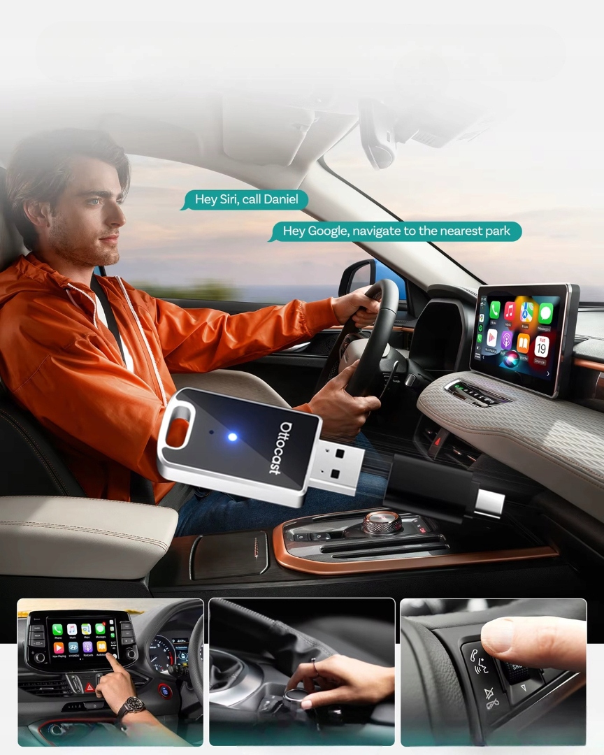Познакомьтесь с Ottocast CA505-T2 — современным USB-адаптером, который превращает проводной CarPlay в удобное беспроводное соединение.