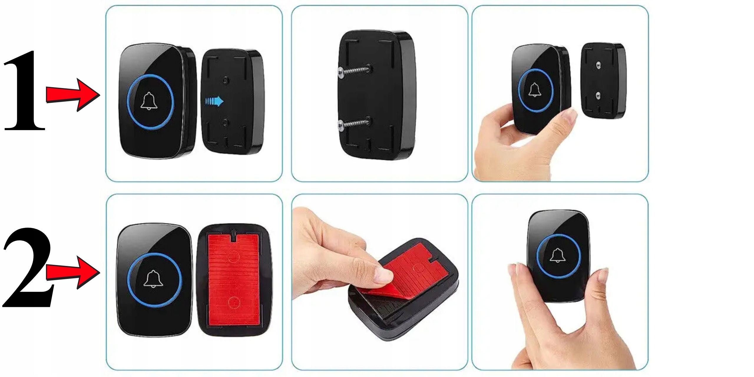 Колокол работает без подключения кабелей - просто поместите его в выбранное место и положите аккумулятор. Приемник готов к использованию сразу после включения. Установка кнопки быстрая и удобная - ее можно приклеить к стене с двумя лентой или прикрепленной винтами (входит в комплект). Благодаря беспроводной конструкции его можно легко перемещать и адаптироваться к изменяющимся условиям использования