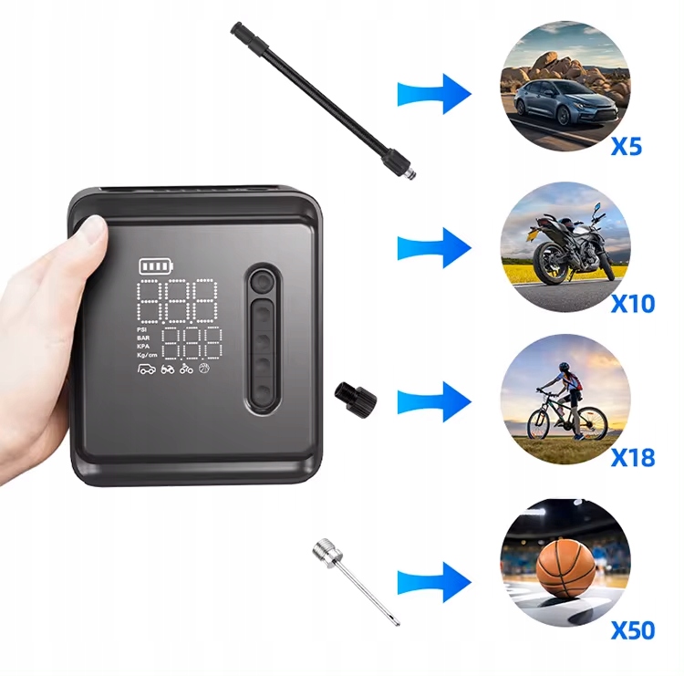 Устройство оснащено точным измерителем давления и ЖК -дисплеем, указывающим значение давления в реальном времени. Компрессор оснащен современным, очень точным электронной системой, анализирующей давление, которое обеспечивает тщательное измерение давления. -Короновое давление и установленное значение. Значение защищает от накачки. Единицы видимы на дисплее