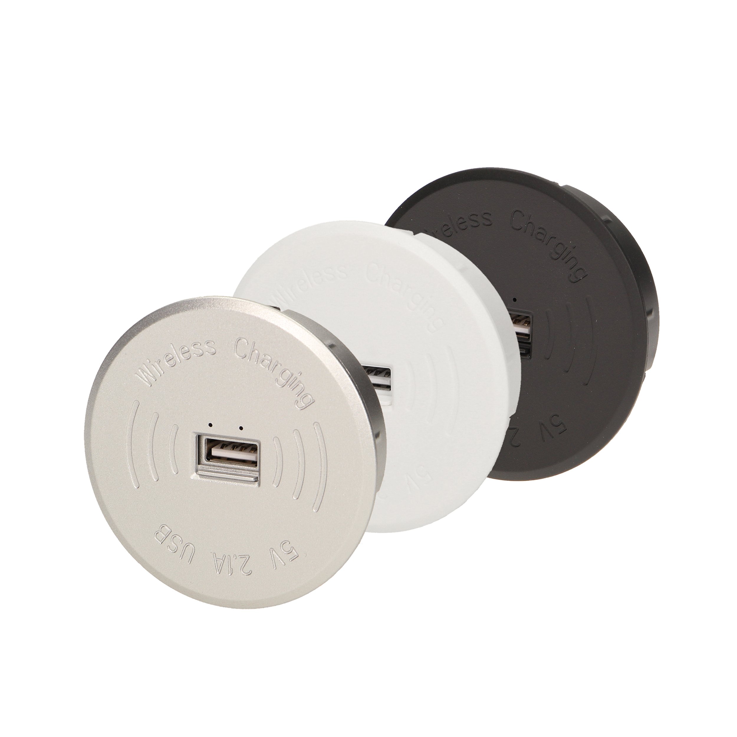 Беспроводное зарядное устройство, совместимое со стандартом Qi V1.1. Работает со всеми типами мобильных устройств, например, планшетами, смартфонами, имеющими функцию индуктивной зарядки. Предназначен для установки в столешницы мебели, столы, столы для переговоров и т. д. Имеет дополнительный USB-разъем для проводной зарядки, защищенный сдвижной крышкой. 2 режима сигнализации зарядки (оптическая - светодиоды и звуковая).