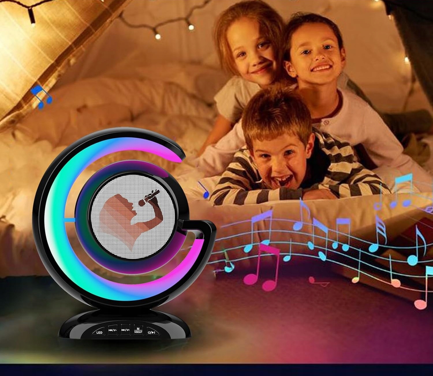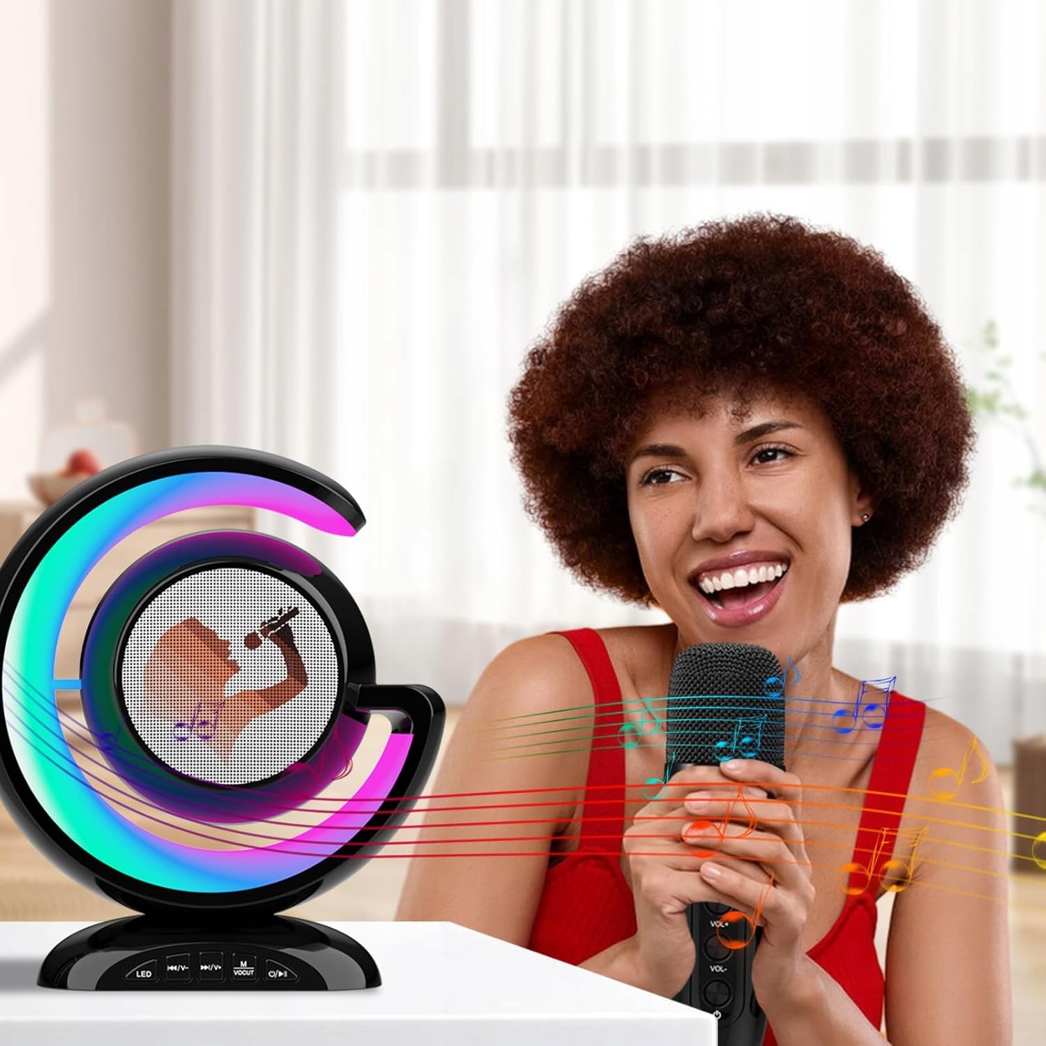 Благодаря созданному светодиодному освещению эффект, набор вводит волшебную атмосферу для каждого развлечения караоке. Способность изменить цвета и динамику света позволяет адаптировать освещение к ритму музыки, добавляя уникальную атмосферу к каждой песне
