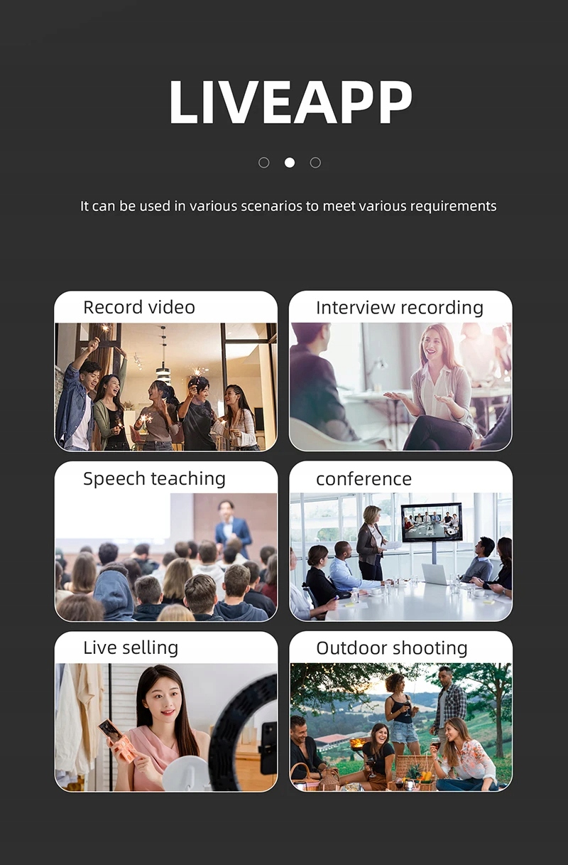 2. Подходит для iPhone, телефонов Android, компьютеров, планшетов и т. Д. Микрофон подходит для передачи видео, записи, конференции, YouTube, Facebook Live, Vlog, Tik Tok, TWITC и т. Д. Toktok, или загрузите программное обеспечение для камеры для других компаний для использования.