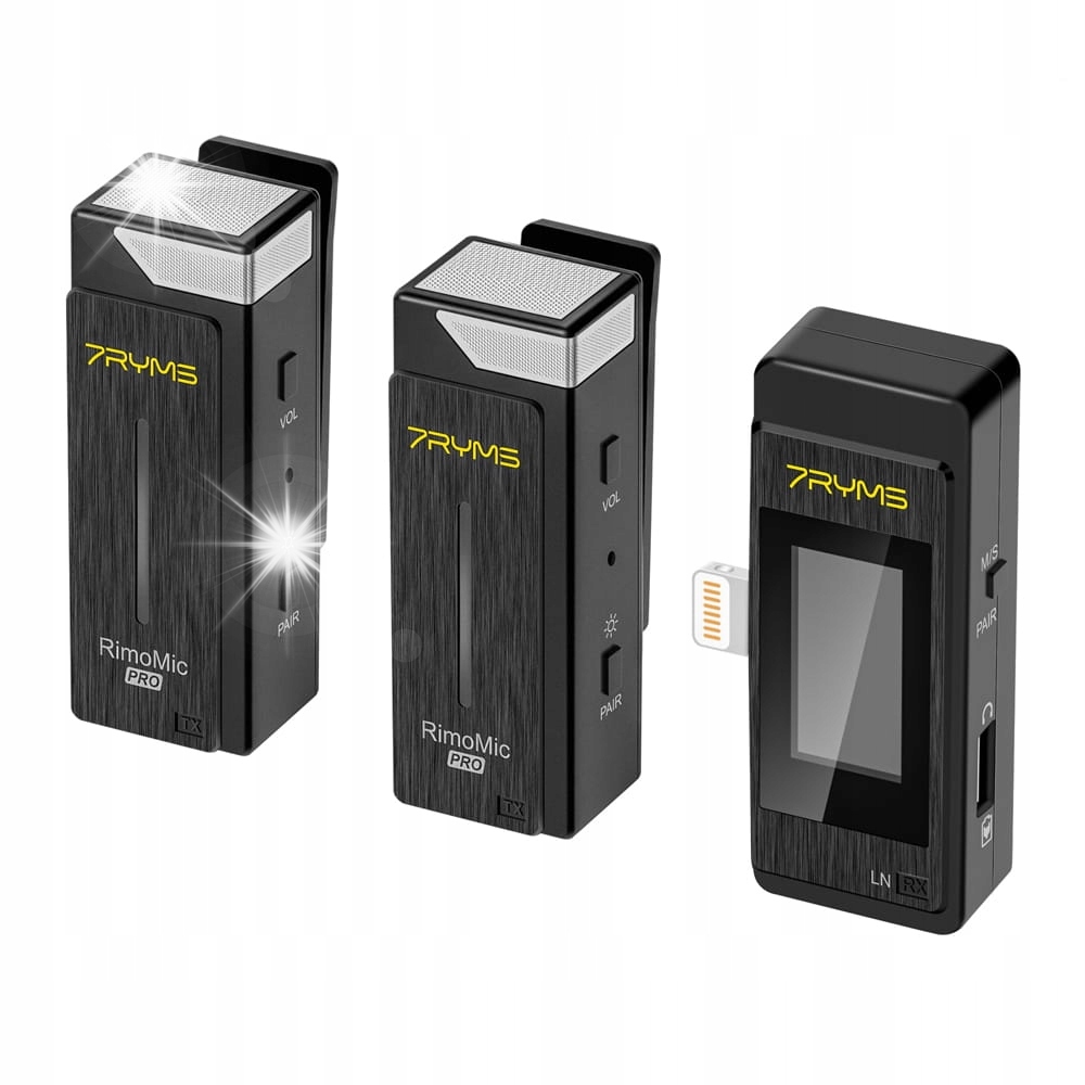 7Ryms RimoMic Pro — это набор микропортов, предназначенный для устройств Apple iOS, таких как iPhone или iPad, который состоит из двух беспроводных микрофонов и приемника с разъемом Lightning. Микрофоны компактны, просты в использовании и удобны. Передатчики имеют клипсы для крепления к блузке или куртке и встроенные аккумуляторы емкостью 95 мАч. Приемник подключается к записывающему устройству и получает энергию непосредственно от него. Микрофоны связываются друг с другом по радиоканалу на частотах 2,4 ГГц на расстоянии до 50 м (без препятствий на местности).