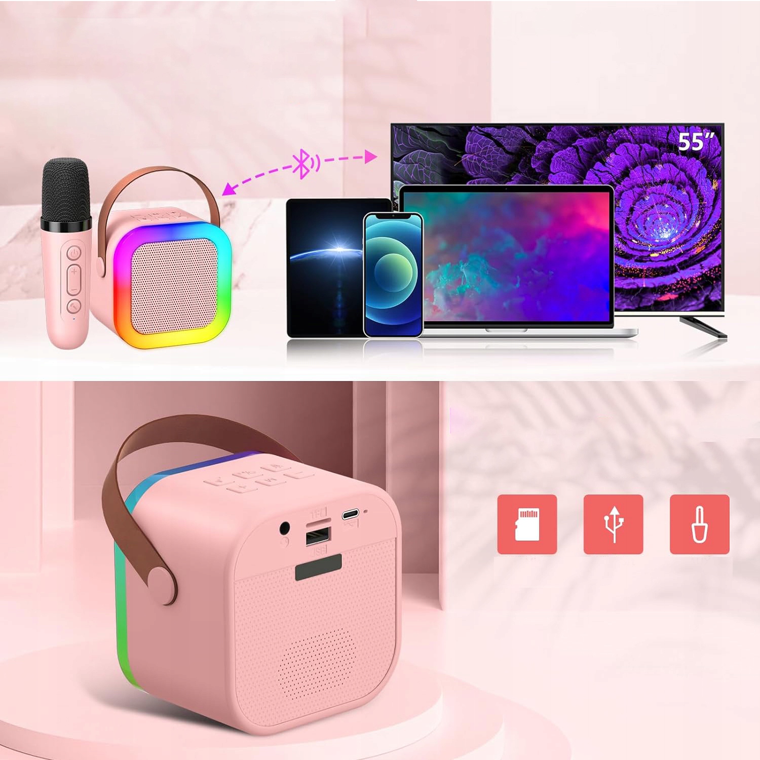 ✅3 режима светодиодной подсветки. Мини-динамик имеет 3 режима светодиодной подсветки (третий режим активируется только во время воспроизведения музыки). Этот продукт может стать отличным караоке-машиной для взрослых, он компактен для маленьких детей.