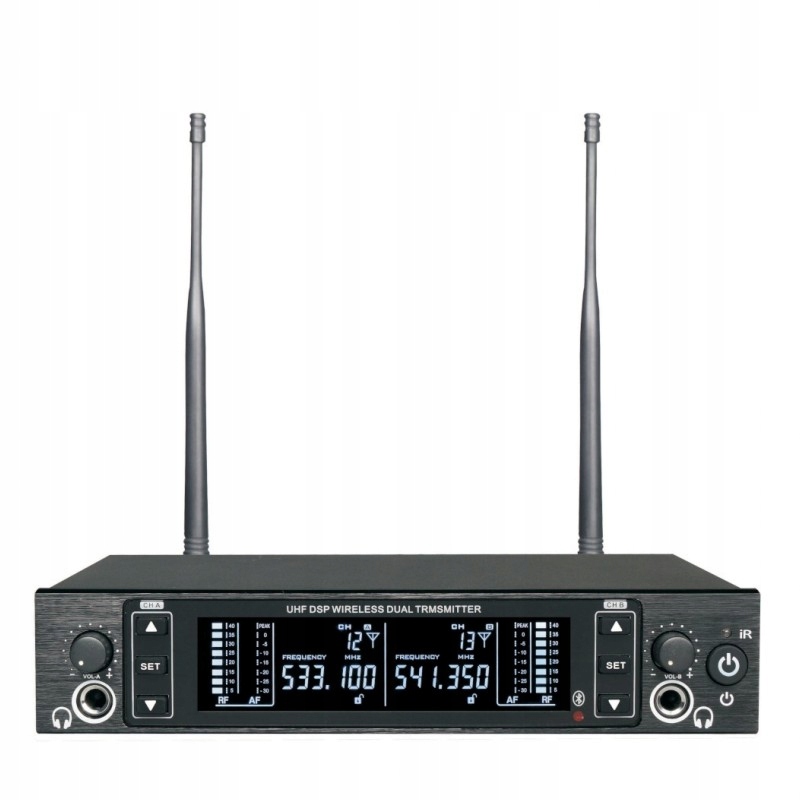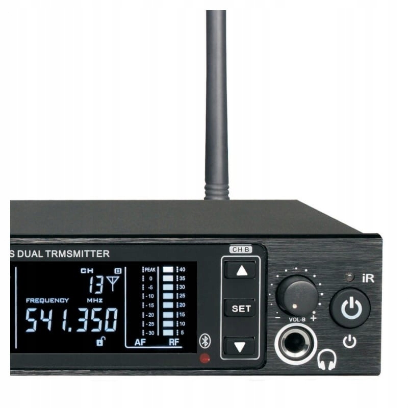 На передней части расположены выключатель питания, два разъема для наушников с потенциометрами громкости и панель управления, оснащенная кнопкамиВверх, Вниз, Установите и очистите ЖК-дисплей. На нем отображаются текущие параметры системы звукового мониторинга, такие как уровень качества сигнала, установленная настройка рабочей частоты и выбранный канал передачи данных.