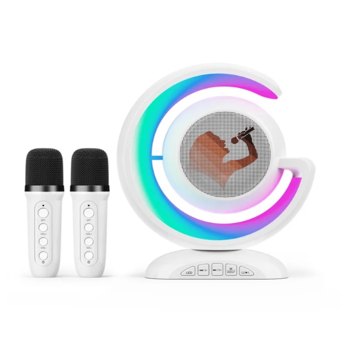 Беспроводной караоке-набор из трех частей 2 микрофона + динамик. Это источник света для развлечений и компаньон для вечеринок. В комплект входят два микрофона и динамик — их можно использовать вместе или по отдельности. Товар добротно сделан и имеет интересный, современный дизайн!