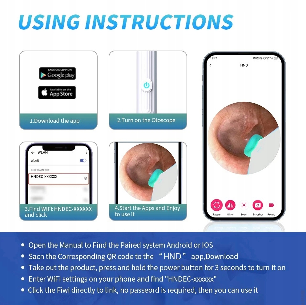 Создано для простой совместимости с телефонами Android и iOS. Беспроводной эндоскоп для очистки ушной серы обеспечивает удобный просмотр и запись на ваше устройство. Беспроводное соединение через WIFI обеспечивает легкую интеграцию с большинством смартфонов Android и iOS. Бесплатное приложение, проверенное в GOOGLE PLAY и AppStore, открывает потрясающие возможности.