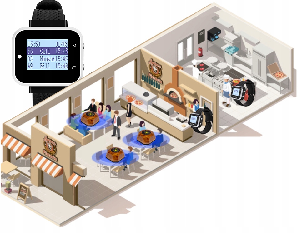 - ✅Простота в использовании; когда необходимо обслужить гостя; просто нажмите кнопку вызова, и часы напомнят официанту о звонках гостя.