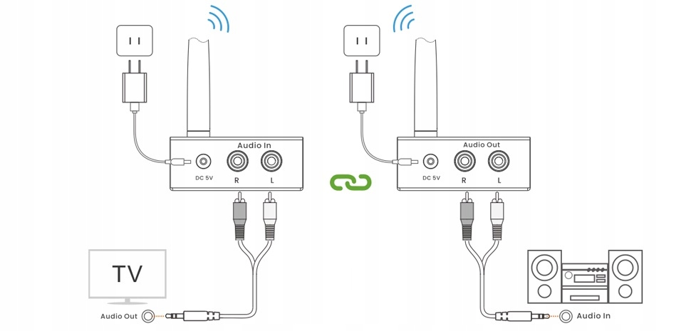 - Беспроводной аудио -передатчик может быть подключен к любому аудио -источнику с выходом AUX 3,5 мм и RCA. Приемник может быть подключен к любому домашнему стереоподобному набору, усилителю и активным динамикам с входом AUX 3,5 мм и RCA.