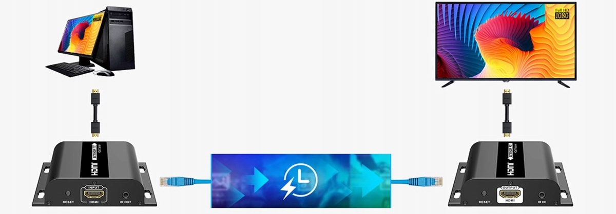 Конвертер Spacetronik HDMI в LAN позволяет передавать изображение по витой паре. 5 или выше к RX. позволяет подключить сигнал высокой четкости (HD) к ресиверу (телевизору, монитору и т.п.), оснащенному разъемом HDMI, по витой паре кат. 5 или выше. В комплект входит приемник (RX). Дополнительным преимуществом устройства является передача функций пульта дистанционного управления посредством входящего в комплект ИК-подсветки.