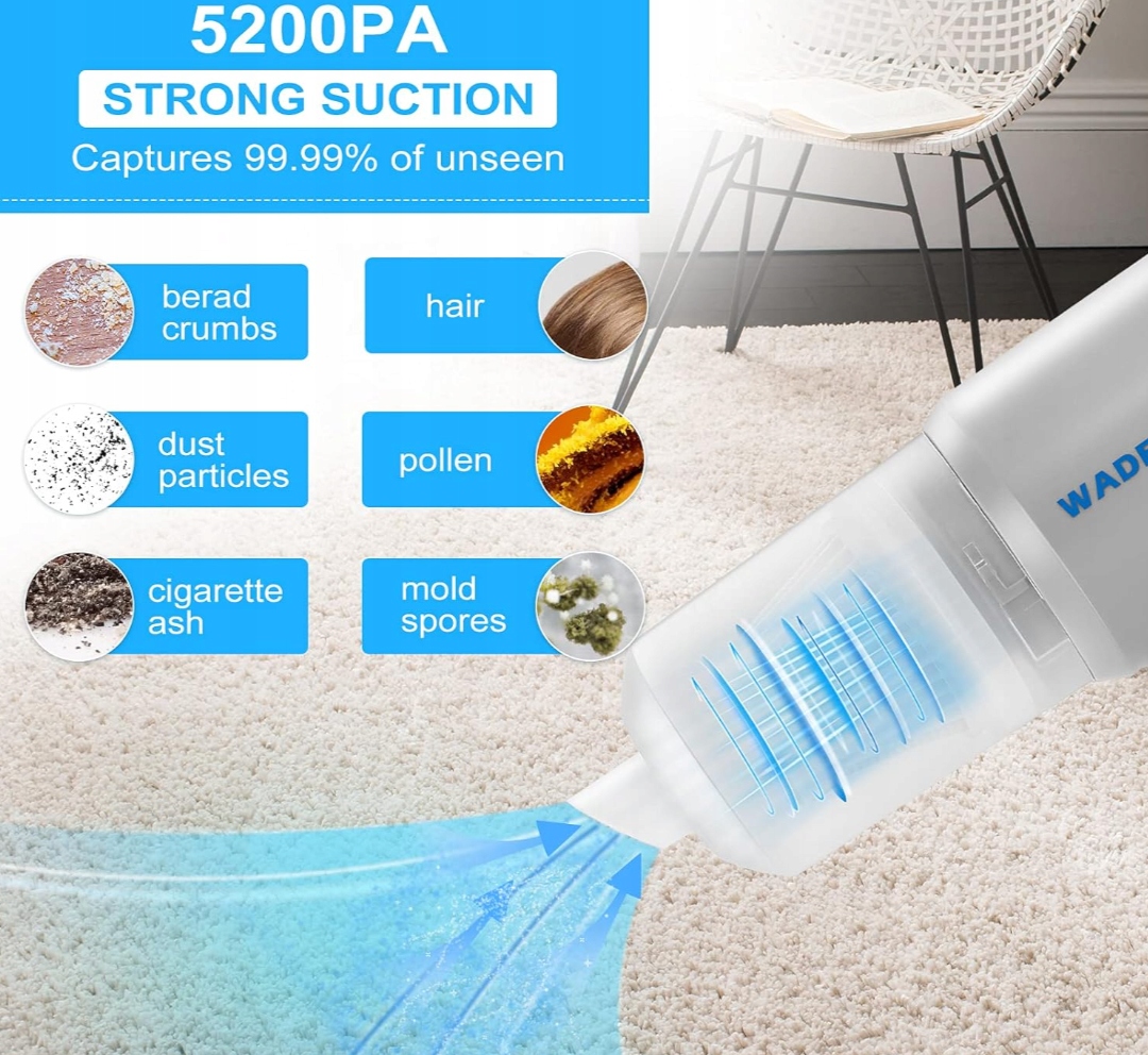 - беспроводной, легкая ручка: Этот многофункциональный вакуумный очиститель весит всего 0,61 фунта (287 г) и имеет всасывающую мощность до 5200 PA; Структура беспроводного пылесоса позволяет вам свободно перемещаться при пылесосе Укладых дома, автомобиля или офиса. Вы можете разместить этот портативный пылесос в любом месте для хранения