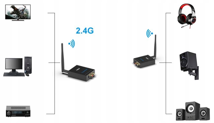 Беспроводной аудиопередатчик 2,4G HIFI передает цифровой сигнал, оптический звук и аналоговый звук R/L через беспроводной сигнал 2,4G на радиочастоте.