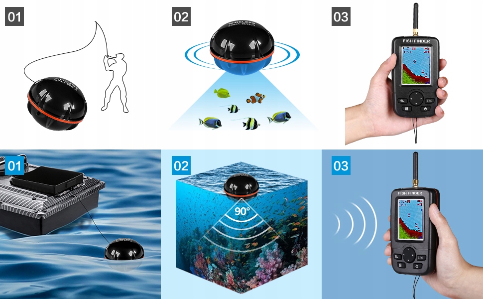 🐟【 Использование функции】 -Птрактает и отображает глубину воды, температуру воды, размер рыбы (малый/средний/большой), глубина рыбы и контур ДНК. Он имеет режимы работы и моделирования. Глубинные и температурные меры могут быть преобразованы. Угол луча сонара: 90 градусы. Диапазон глубины: 2,6-118 футов/ 0,8–36 m. Диапазон беспроводного расстояния: 131 футов/40m .