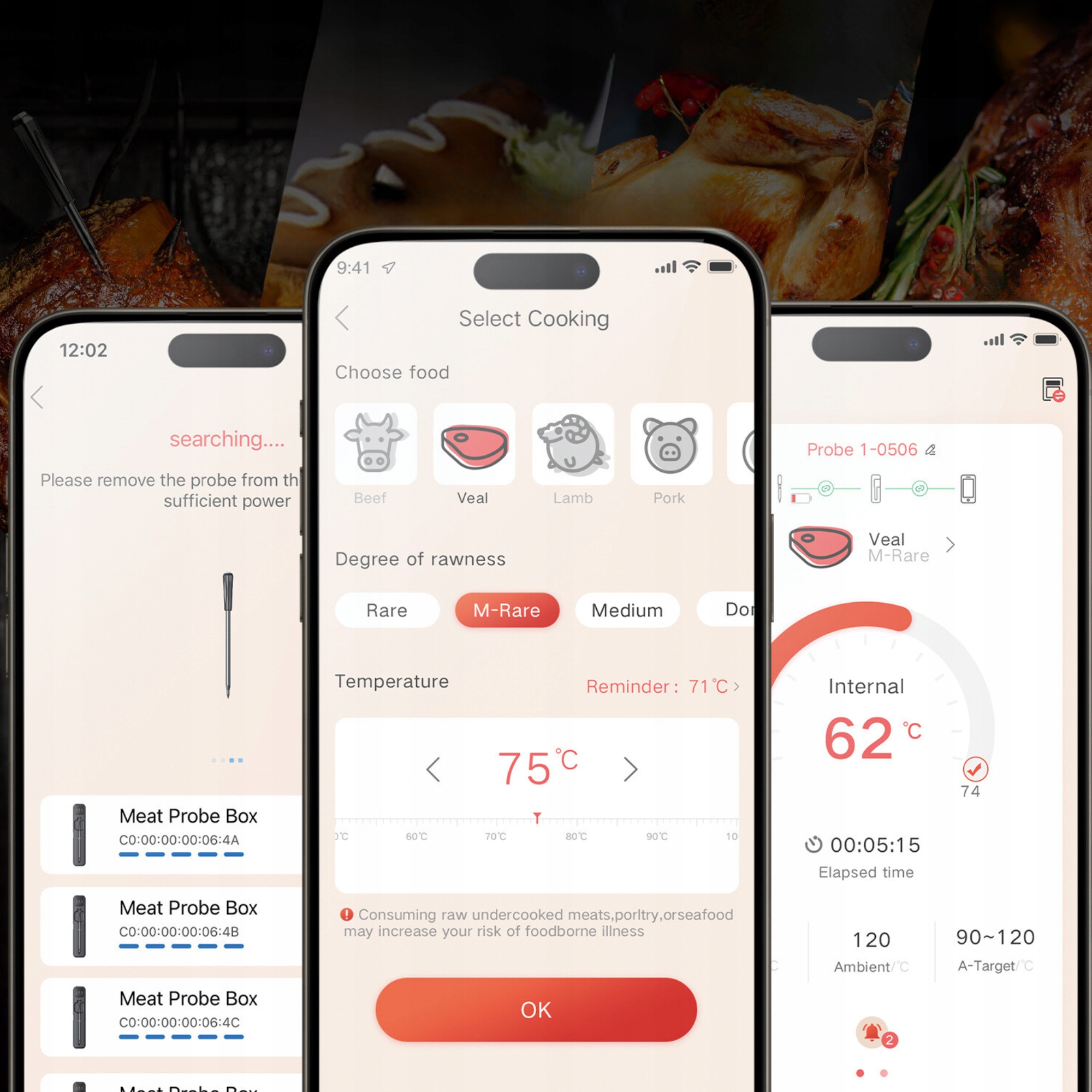 Прибор позволяет точно определять температуру внутри мяса, что позволяет добиться идеальных результатов при запекании или гриле - мягкости, сочности и хорошо прожарки. приправленное мясо. Он также прост в использовании и не требует особых усилий. Просто вставьте датчик термометра для мяса и считайте температуру на своем телефоне, прежде чем выбирать подходящий тип мяса из доступных.